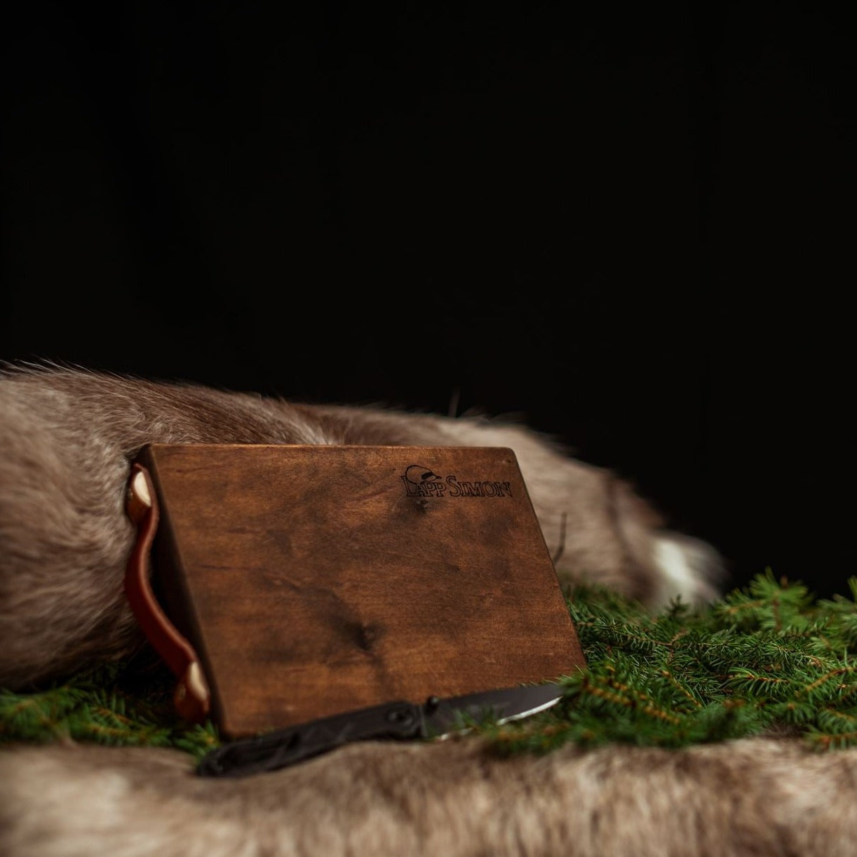 Klassisk skärbräda tillverkad i massiv alträ, vilket är samma träslag som vi använder för våra gedigna rökningsprocesser. En stilren läder-rem omsluts med infästningar av renhorn för den äkta känslan av norrländska arvet. Perfekt för att lasta upp lite nyinköpt torkat renkött och sen är det bara karva på!